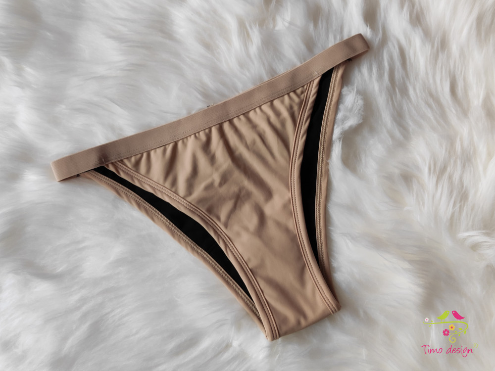 Testszínű menstruációs bugyi, enyhe - közepes erősségű vérzéshez, brazil bugyi fazonban. A középső nedvszívó és nedvességzáró réteg 28 cm-en fut végig, így maga a bugyi olyan, mintha egy 28 cm-es betét lenne belevarrva. A nedvszívó réteget legbelül fekete biopamut borítja, ez érintkezik a bőrrel, amely nem irritál. Sőt mensibugyi használatával a környezetért is tehetsz, mivel mosható és többször is használható, így könnyen elindulhatsz a zero waste életmód irányába!