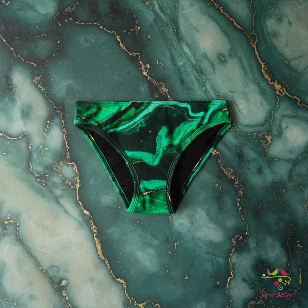 Zöld márvány mintás menstrációs bugyi, erős vérzés esetére, bevarrt magos kialakítású. A középső rétegnél laminált- és biopamut rétegeket alkalmaztunk az extra védelemért. Plusz egészségügyi betét nem szükséges, önmagában is véd közepes erősségű vérzés esetén, így kényelmes megoldás a hétköznapokban.