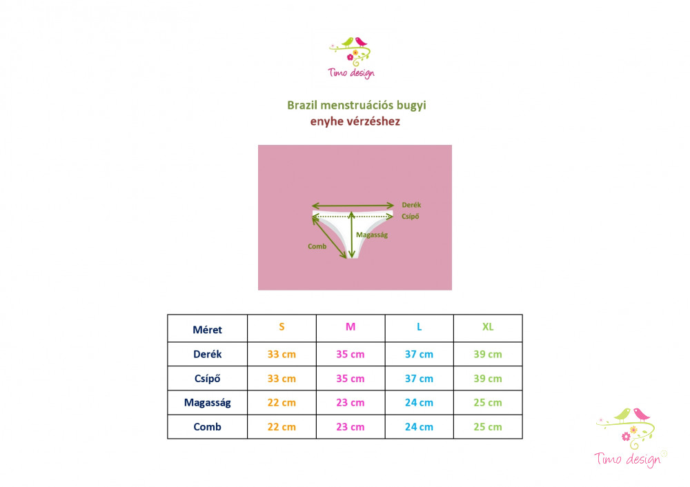 A megfelelő méret kiválasztásában segít a mérettáblázat: a megadott adatok a kiterített bugyira vonatkoznak és centiméterben értendők (derék, csípő, combrész, bugyi magassága).